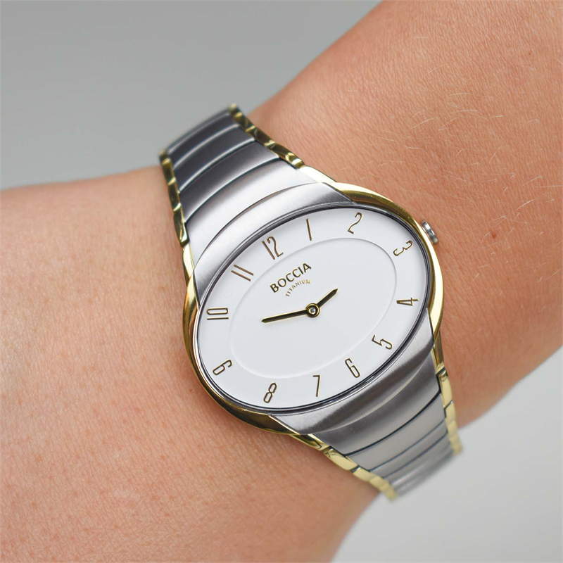 Entdecken Sie die Uhr DAU-Q TI,BICO,ZBL:WEI�/GOLD IND, Modellnummer 3165-11. Sie besticht durch ein silberfarbenes, ovales Titangehäuse und -armband, ein weißes Zifferblatt mit arabischen Zahlen und Quarzwerk. Wasserdicht bis 5 bar. Perfekt für den Alltag als elegante Armbanduhr. Ideal für Menschen mit empfindlicher Haut dank antiallergischen Eigenschaften. Tragen Sie sie als stilvolles Accessoire.