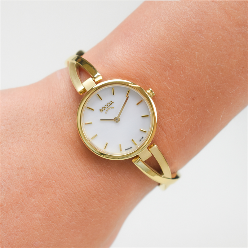 Diese elegante Uhr, Modellnummer 3239-03, zeichnet sich durch ein Gehäuse und Armband aus Titan mit goldfarbener Beschichtung, ein Perlmutt-Zifferblatt und Saphirglas aus. Die Uhr mit Analoganzeige ist wasserdicht bis 5 ATM und besonders hautverträglich. Tragen Sie dieses stilvolle, neue Accessoire bei formellen Anlässen oder im Alltag. Kein Smartwatch-Feature.