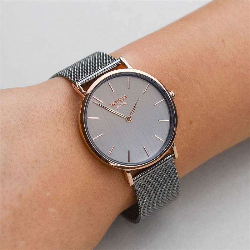 Entdecken Sie das elegante Modell 3273-08, eine stilvolle Armbanduhr mit Quarzwerk, grauem Zifferblatt und Titangehäuse in Roségold. Das runde, analoge Design besticht durch ein mineralverstärktes Glas und ein antiallergenes, graues Milanaise-Armband aus Edelstahl. Wasserdichtigkeit bis 3 Bar. Perfekt für elegante Anlässe oder den täglichen Business-Look. 36 mm Gehäuse, 18 mm Armbandbreite. Keine Datumsanzeige.