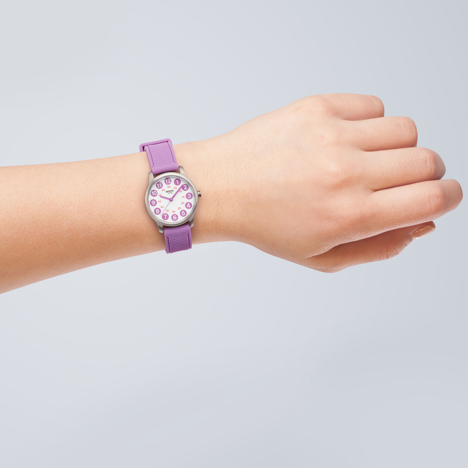Diese Uhr, Modellnummer 3373-01, verfügt über folgende Eigenschaften: Lila Armband, Titangehäuse, Quarzwerk, wasserdicht bis 5 atm, analoges Zifferblatt. Ideale Trageweise: Am Handgelenk, mit einem komfortablen lila Kunststoff-Silikon-Armband und einer Breite von 14 mm. Perfekt für stilvollen Minimalismus im Alltag. Keine Datumsanzeige, daher einfach und elegant.