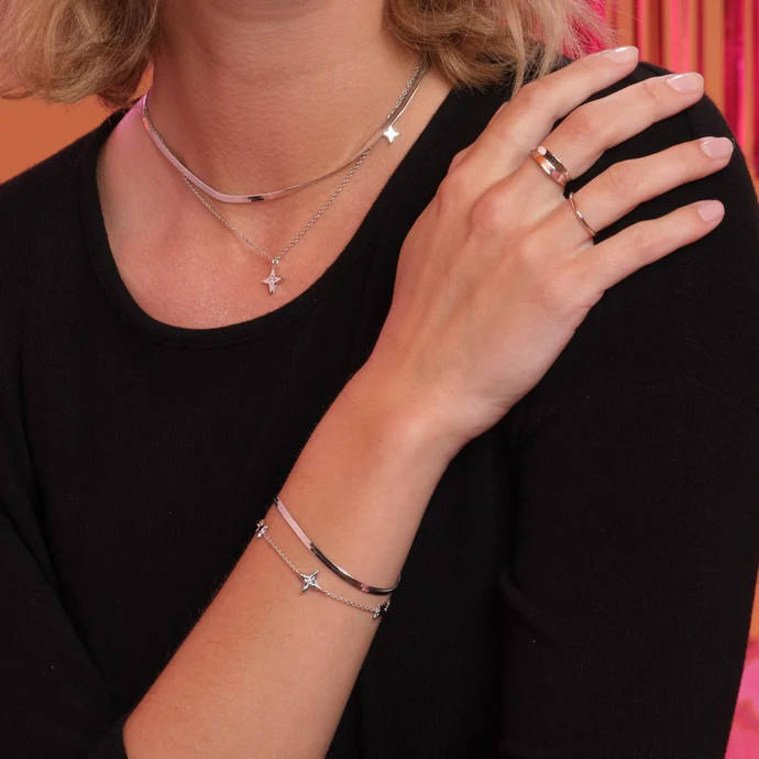 Das Armband Bestehend aus hochwertigem rhodiniertem Silber, bietet es einen flachen, modernen Look. Tragen Sie es stilvoll am Knöchel, um jedem Outfit einen Hauch von Eleganz und Raffinesse zu verleihen. Perfekt für den Alltag und besondere Anlässe.